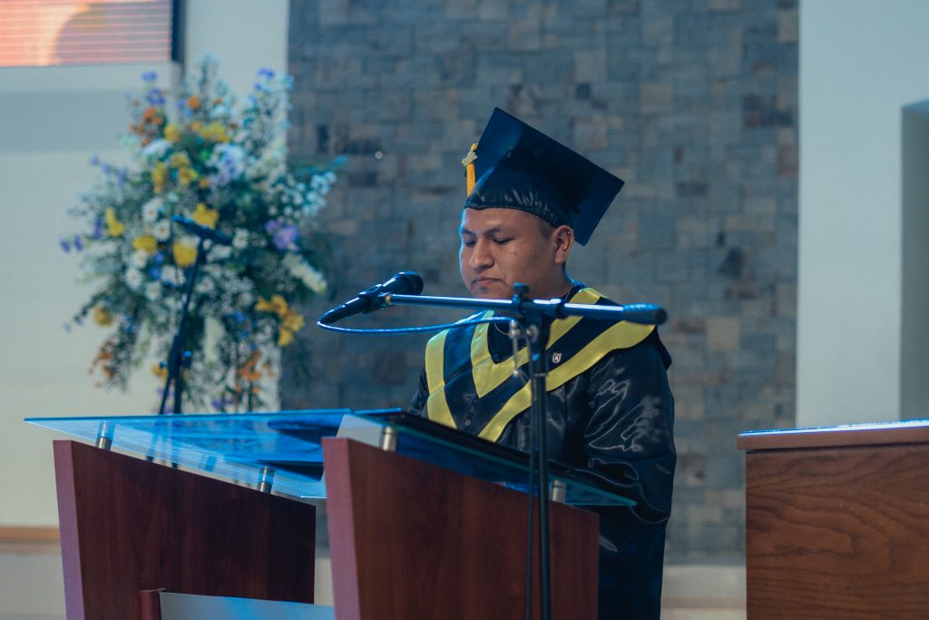 Iniciada el acto solemne, hizo uso de la palabra el Vicerrector Académico, Sr. Erwin Jerez Cáceres, quien se dirigió a los presentes, felicitando especialmente a quienes se titulaban en ese momento, y en parte de su discurso, señaló: “Los fatores personales que nos llevan al éxito sí están bajo nuestro control, solamente mencionaré siete elementos personales que considero los llevarán a tener una vida exitosa: primero, preparación continua; segundo, colabora con otros; tercer elemento, tercer factor del éxito, se constante y persevera; cuarto elemento, mantén un propósito fijo; quinto elemento, piensa siempre positivo; sexto, se una persona servicial; por último, confía y cree en Dios.