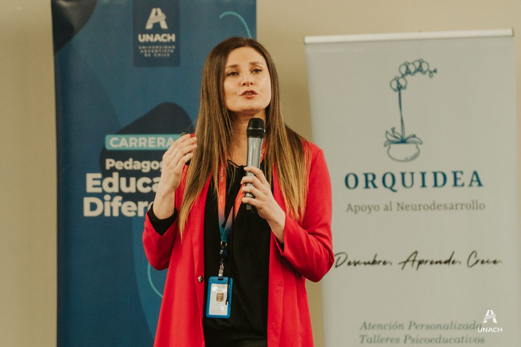Carolina Morales, Terapeuta Ocupacional e integrante del Centro Orquídea de Apoyo al Neurodesarrollo de Chillán, desarrolló una ponencia centrada en compartir el abordaje de la integración sensorial en personas autistas, dando a conocer estrategias prácticas que permiten la toma de decisiones de cómo trabajar adecuadamente con este grupo de personas, buscando su autonomía y el disfrute de sentirse parte del contexto con el cual conviven.